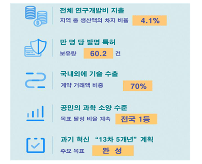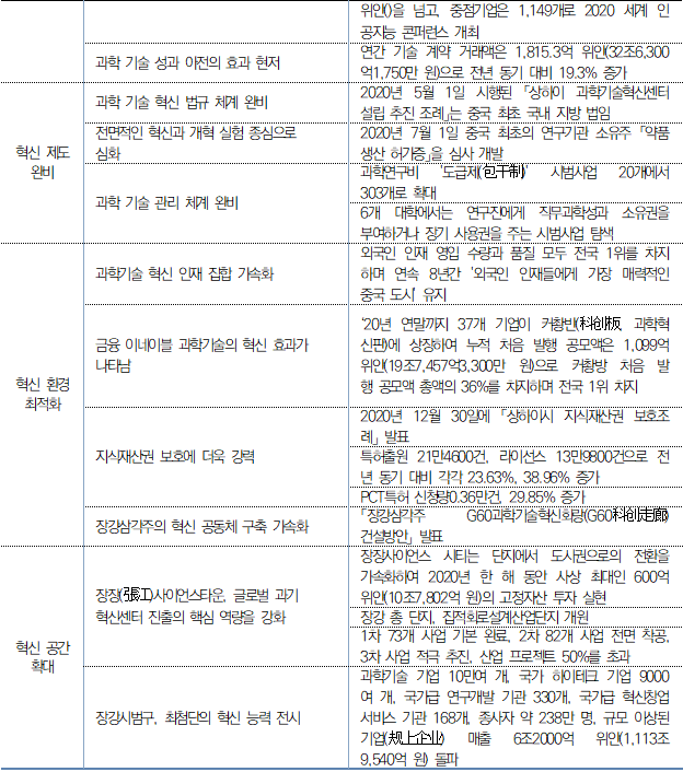 동향 게시판 게시글 제목, 작성일, 조회수, 내용을 포함합니다. 2020년 상하이과학기술혁신센터 성과 발표 등록일2021.09.15 조회수790 첨부파일 20210830_2020년-상하이과학기술혁신센터-성과-발표.pdf - 2020년 상하이과학기술혁신센터 성과 지표별 달성 완료○ 연구개발비가 지역 내 총 생산액에서 차지하는 비중은 4.1%이며, 만명당 발명특허 보유량은 60.2건 기술 수출 계약 거래액 비중은 70% 실현 ○ 상하이 과학기술혁신센터 건설의 중점 조치와 중대한 성과는 아래와 같음 정보출처 :https://m.thepaper.cn/baijiahao_14270646 목록