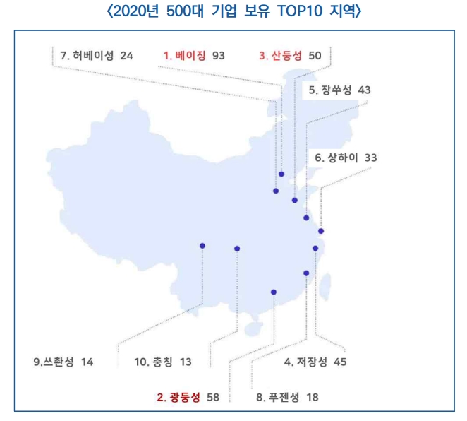 ● (지역별) 지난 해 ‘500대 기업’이 가장 많은 5대 지역은 베이징, 광둥성, 산둥성, 저장성, 장쑤성임