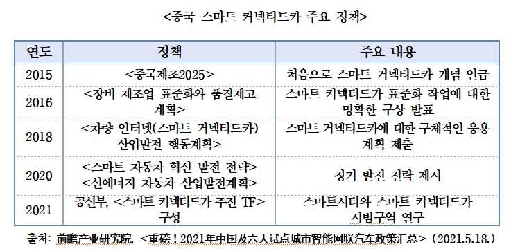 ● 스마트 커넥티드카는 제14차 5개년 계획에서 중국 “제조 강국” 전략실시를 위한 8대 핵심기술 중 하나로 선정