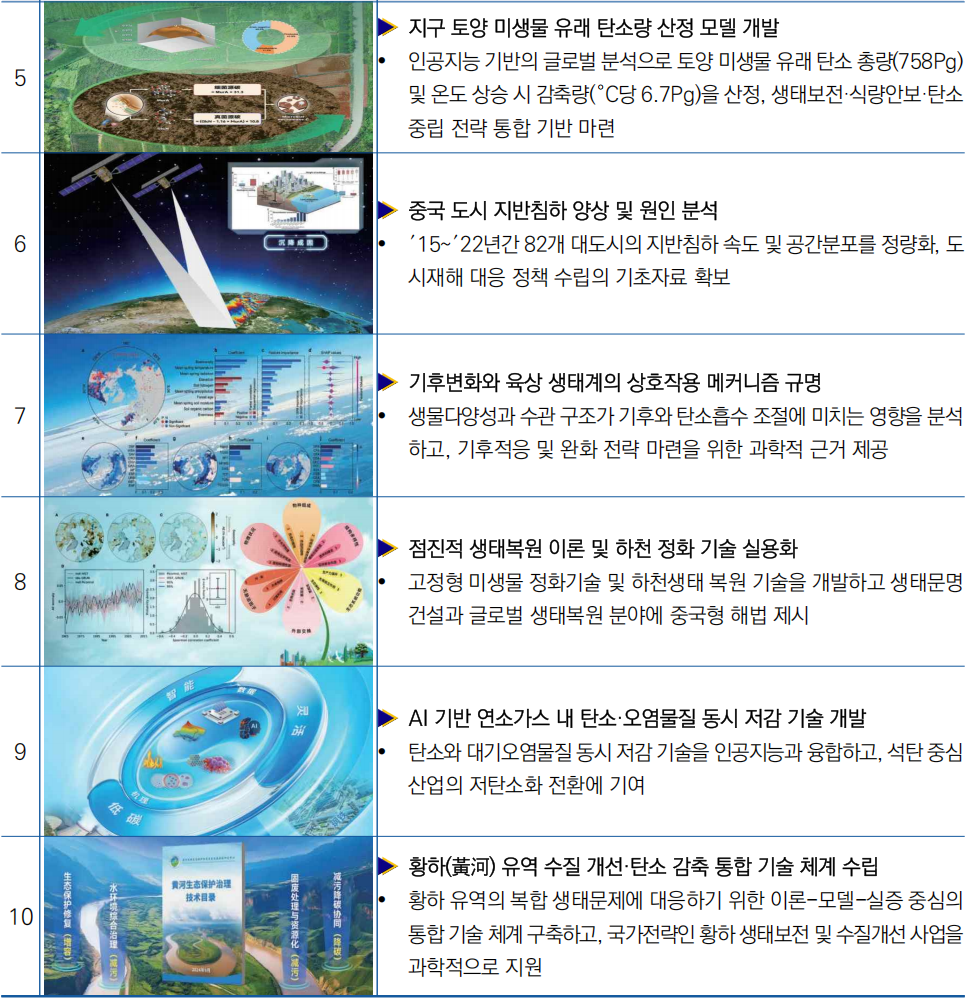 ○ (주요 내용) 기후변화 대응, 탄소중립, 생태복원, 대기질 개선 등 핵심 분야에서 인공지능 기반 기술과 정량 분석을 바탕으로 실용화와 정책 지원 능력을 강화한 연구 성과로 평가됨