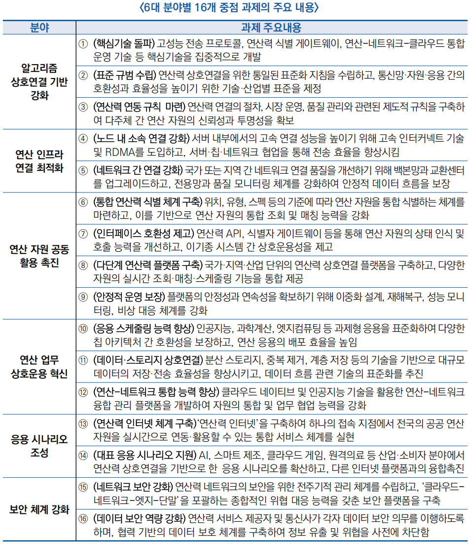 ![]() ○ (중점 과제) 알고리즘 상호연결 기반 강화, 연산 인프라 연결 최적화, 연산 자원 공동 활용 촉진, 연산 업무 상호운용 혁신 등 6대 분야의 16개 중점 과제를 제시