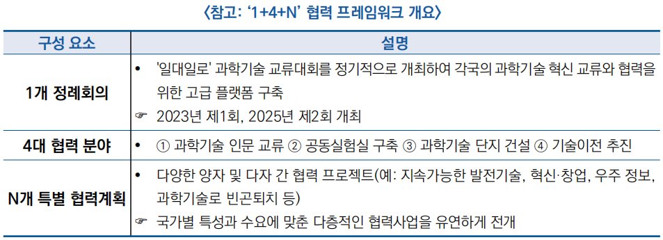 ![]() □ (일대일로 과학기술 혁신 행동계획) 2017년 시진핑 주석이 국제협력 정상포럼에서 공식적으로 제안한 이후, 중국은 ‘1+4+N’ 프레임워크를 기반으로 협력 체계를 구축하였으며, 2024년 기준 80여 개국과 정부 간 과학기술 협력 협정을 체결하는 등 가시적인 성과를 창출했음