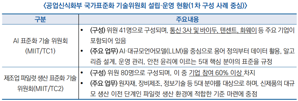 □ 중국 공업신식화부(MIIT)는 2024년 말 부처 최초의 국가표준화 기술위원회인 ‘인공지능 표준화 기술위원회’를 설립한 데 이어, ′25년 초에는 제조업 파일럿 생산 표준화 기술위원회를 신설함. 이어 ′25년 6월에는 사물인터넷, 뇌-기계 인터페이스, 민용 폭발물 등 3개 분야에서도 위원회를 추가 설립함(6.4)