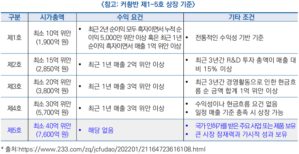 ![]() - (전문기관 투자자 제도 시범 도입) 커촹반은 해외 사례를 참고해, 제5호 상장 기준을 적용받는 기업의 경우 일정 자격을 갖춘 전문기관 투자자가 얼마나 오랫동안, 어느 정도 규모의 지분을 보유하고 있는지를 상장 심사 시 중요한 참고 요소로 반영함