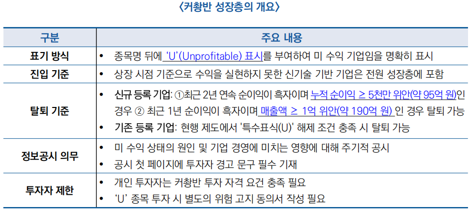 ○ “1”은 수익성이 없는 기술 스타트업도 상장할 수 있는 ‘성장층(Growth Tier)’ 이라는 새로운 제도를 도입한 내용이며 기존 상장 적자기업과 신규 기업 모두를 커촹반 성장층에 편입시키며 종목명에 'U' 표시를 부여해서, 투자자들에게 투자의 위험도 정보를 명확히 전달