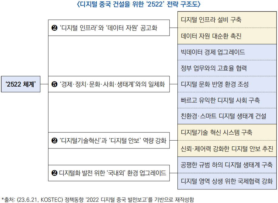 - 동 계획은 ‘2522 체계’를 중심으로, 2대 기반(인프라·데이터 자원), 5대 영역(경제·정치·문화·사회·생태계)의 통합 디지털화, 2대 역량(기술혁신·안보), 2대 환경(국내·국제)을 아우르는 체계적 추진 로드맵을 담고 있음