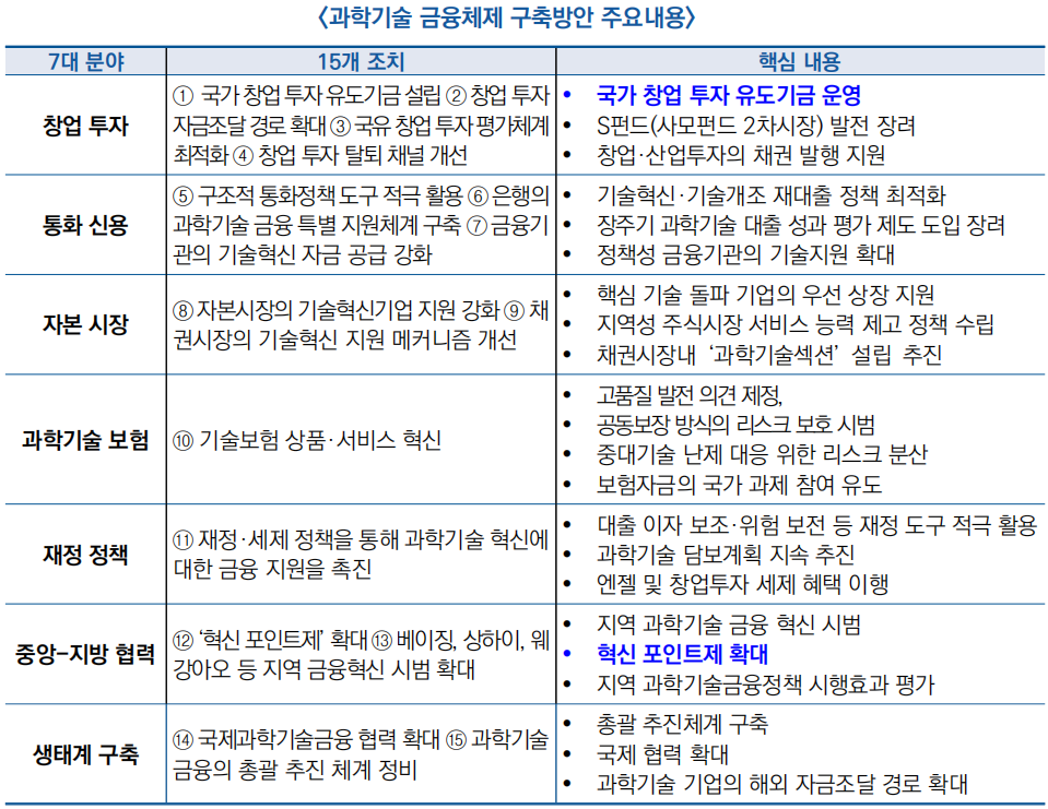 ○ (주요 내용) 이번 정책은 창업 투자, 통화 신용, 자본시장, 과학기술 보험, 재정 정책, 중앙-지방 협력, 생태계 구축 등 7대 분야를 중심으로 15개 조치를 제시