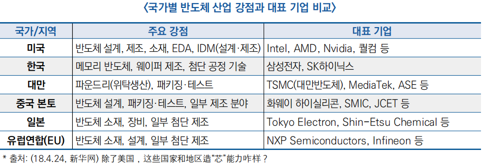- 특히 TSMC, 삼성, 인텔 등 주요 기업이 2nm 이하의 첨단 공정 양산을 주도하며 글로벌 기술 우위를 확보하고 있으며, AI 전용 칩, 고급 패키징 기술, 탄화규소(SiC)·질화갈륨(GaN) 등 3세대 반도체 소재가 새로운 국제 기술 경쟁의 핵심 분야로 부상