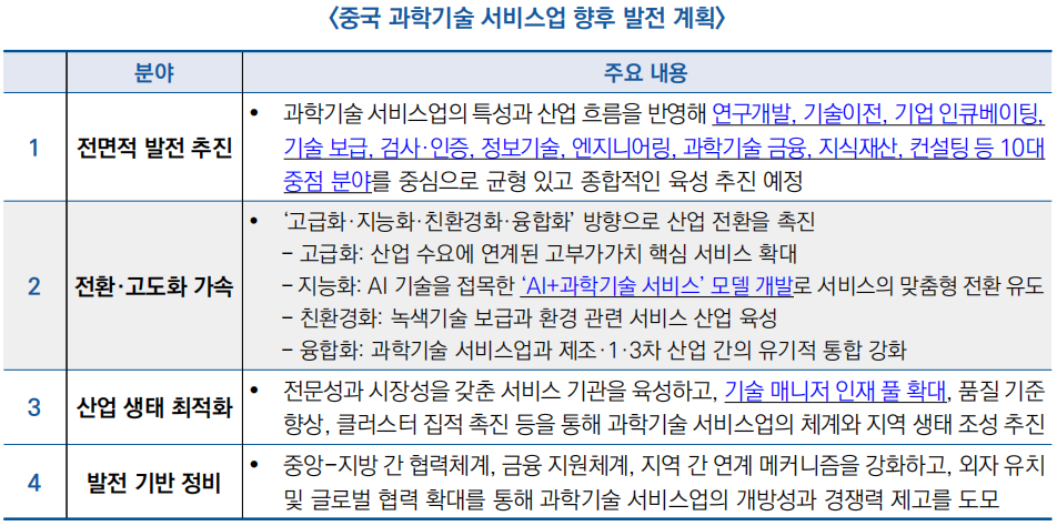○ (현황) 중국은 정책 기반 정비와 산업 기반 확충을 통해 과학기술 서비스업을 고부가가치 신흥산업으로 육성하고 있으며, 기술 혁신과 산업 고도화의 핵심 지지축으로 부상