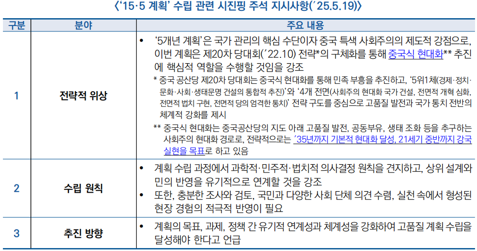 - 시진핑 주석은 해당 계획을 ‘중국식 현대화를 실현하기 위한 핵심 설계’로 규정하며, 과학적·민주적·법치적 의사결정 원칙을 기반으로 고품질 수립을 강조