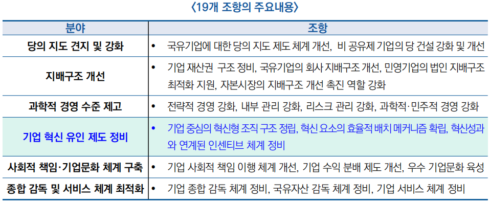 - 민영기업에 대해서는 법인 지배구조 정비, 경영 투명성 제고, 가족기업의 경영모델 혁신 등을 통해 자율성과 창의성을 강화할 수 있는 제도적 기반 마련을 주문함