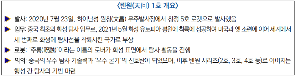 - (톈원 1호) 중국은 앞서 2020년 7월 ‘톈원(天问) 1호’를 통해 화성 탐사에 착수, 이듬해 5월 화성 유토피아 평원에 착륙하며 궤도선·착륙선·로버를 통한 다중 탐사 시스템을 운용하고 있음