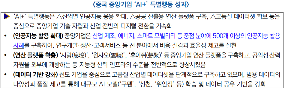 ○ (개요) 중앙기업의 ‘AI+’ 특별행동은 국자위가 2024년부터 추진 중인 전략으로, 중앙기업의 인공지능 기술 내재화와 응용 확산을 통해 산업 경쟁력을 제고하는 것을 목표로 함