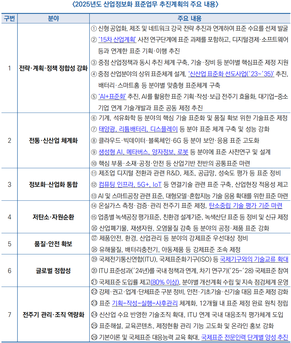○ (내용) 이번 계획은 산업 전략·계획·정책과의 정합성 강화, 전통·신산업 표준체계 고도화, 국제표준 정합성 제고 등 7개 분야 26개 세부 과제를 중심으로 산업 고도화와 표준 경쟁력 강화에 주력