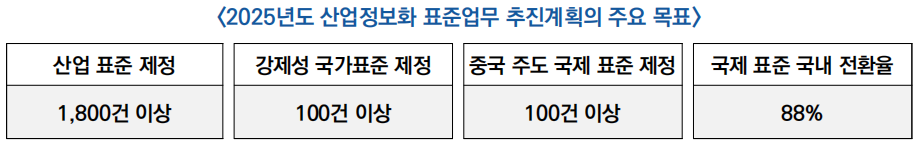 □ 공업신식화부는 ‘2025년도 산업정보화 표준업무 추진계획’을 발표하고, 산업표준 1,800건 이상 제정 및 국제표준 도입률 88% 달성을 목표로, 7대 분야 26개 과제를 제시(25.4.8)