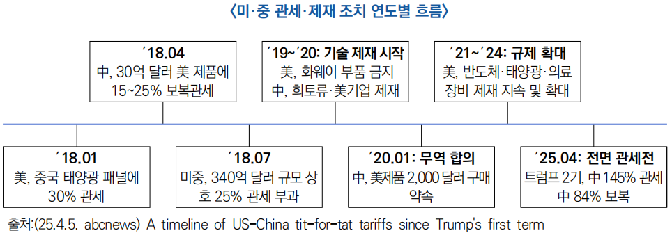 □ (미·중 통상갈등 개요) ′18년 미·중 관세전쟁 발발 이후 상호 보복 관세와 기술 규제가 지속·확대되어 왔으며, ′25년 트럼프 재집권 이후 미국의 145% 전면 관세 발표로 갈등이 사상 최고 수준으로 격화됨