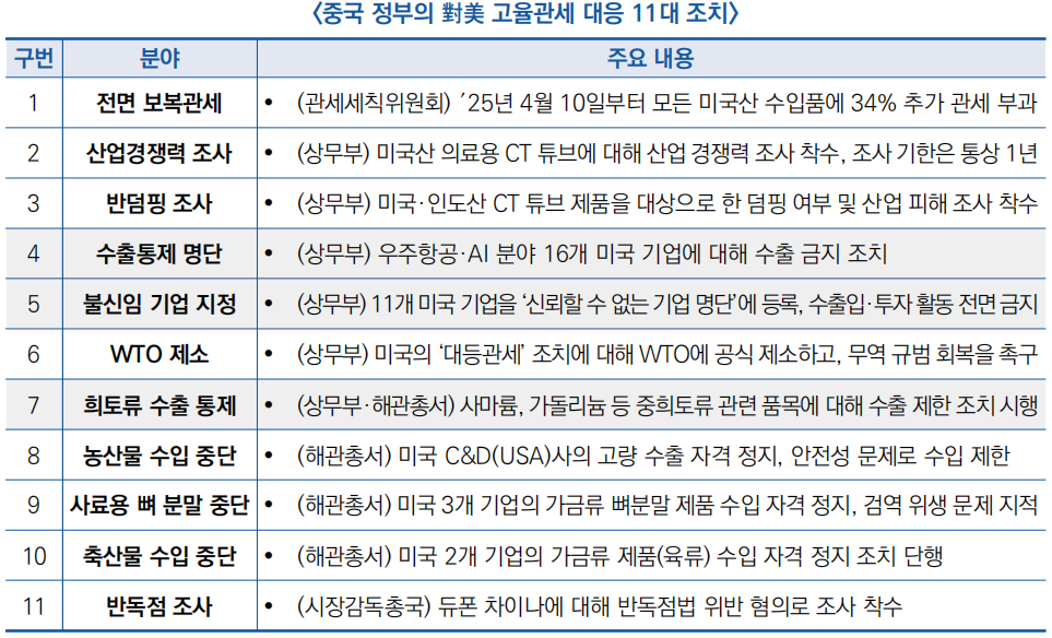 | 2025년 미·중 관세전, 中 대응 조치 전방위 확산 추이 주목 | ||