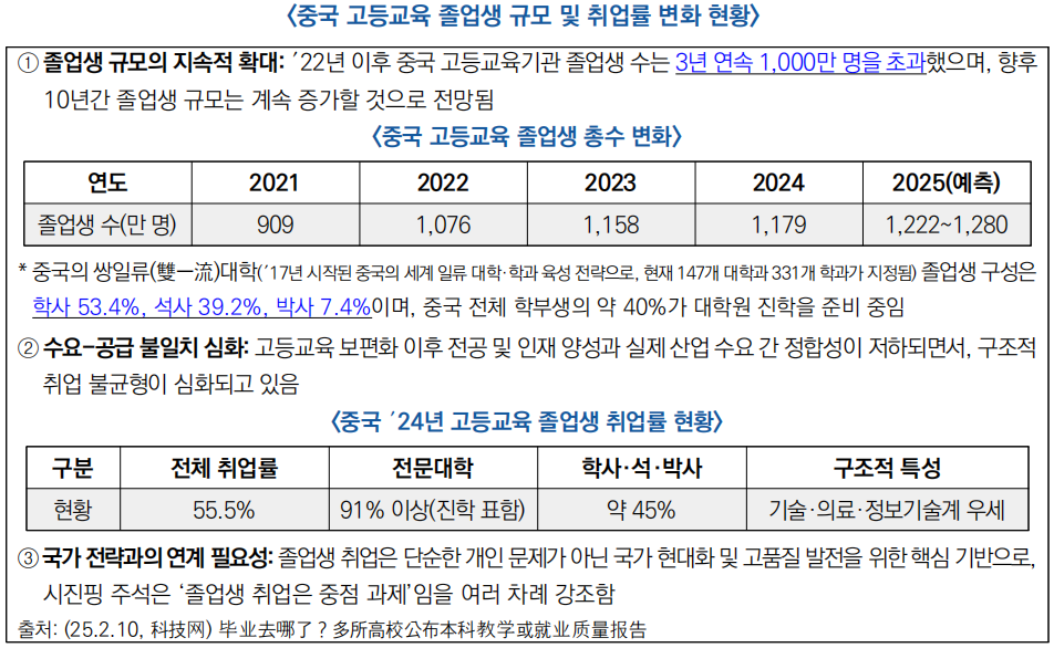 □ 중국 국무원은 ‘고등교육기관 졸업생* 고품질 취업지원체계 구축 가속화에 관한 의견’을 발표하고, 급증하는 졸업생 수와 고용시장 간 수급 불일치 해소를 위한 체계적 대응에 착수(25.4.8)