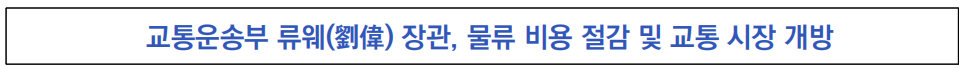 - 향후 정부 업무 보고서에 따라 교통 물류 시스템을 지속적으로 개혁하여 물류 비용을 줄이고, 효율적인 교통망을 구축할 방침