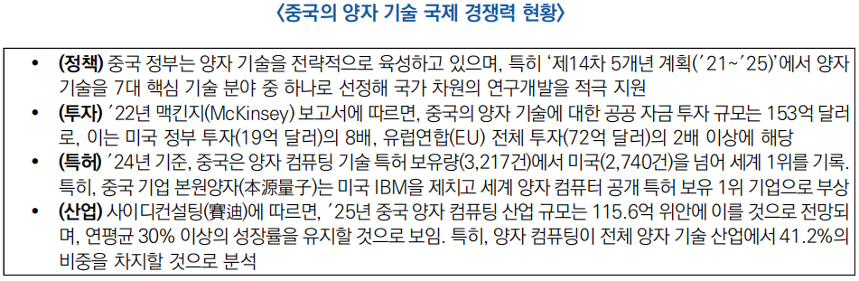 ○ (중국의 양자 기술 전략) 중국은 양자 기술을 국가 전략적 핵심 분야로 지정하고, 정책 지원, 대규모 투자, 특허 경쟁력 강화 및 산업 성장을 통해 글로벌 선도국으로 부상