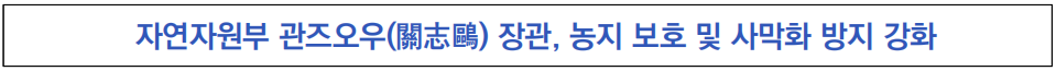 ![]() - 국가 핵심 과제인 18억 무(畝)* 농지 보호를 위해 디지털 농지 관리 체계를 구축하고, ‘점유한 만큼 보충’(佔一畝補一畝) 원칙을 준수하여 농지 감소 방지 및 질적 향상을 도모할 계획