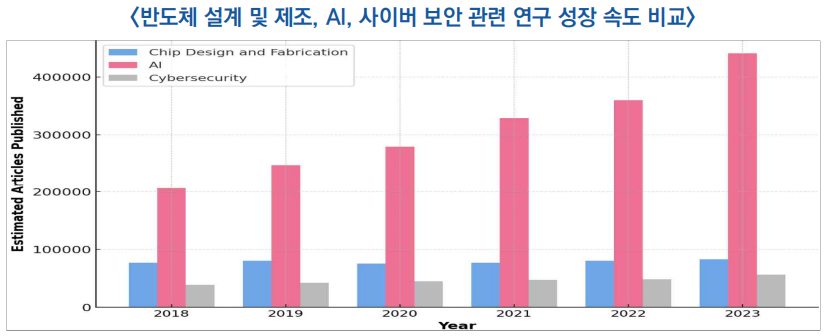 - ′18~′23년 반도체 연구 논문 수는 전체적으로 8% 증가했으며, 같은 기간 AI 및 대형언어모델(LLM) 연구가 급속도로 성장한 것과 비교하면 상대적으로 완만한 증가세를 보임
