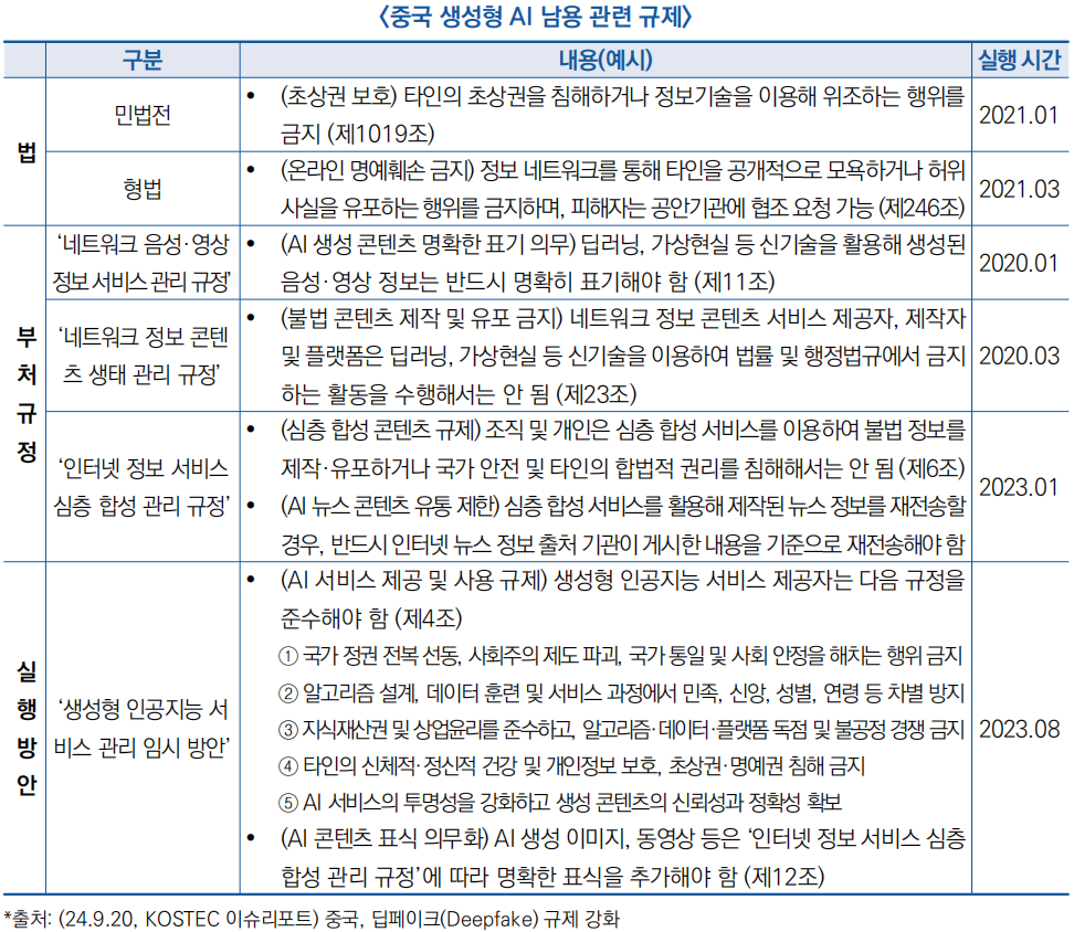 ![]() □ (관련 규제) 중국은 딥페이크와 생성형 AI의 남용에 대응하기 위해 이미 ‘민법전(民法典)’ , ‘형법(刑法)’, ‘규정(規定)’의 다층적 규제 프레임으로 실행 방안을 마련하여 데이터 생성 및 위조의 전체 과정을 규제