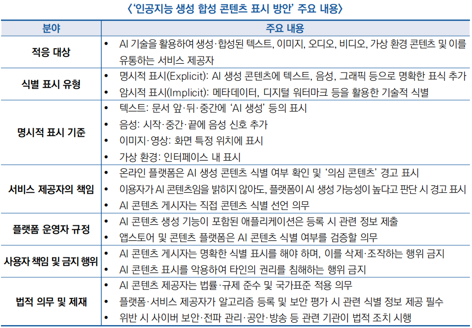 ![]() ○ (주요 내용) 이번 방안은 총 14개 조항으로 구성되며, AI 생성 콘텐츠에 대한 명시적(Explicit)·암시적(Implicit) 식별 표시 의무화, 콘텐츠 유통 과정의 검증·추적 강화 등 내용을 포함