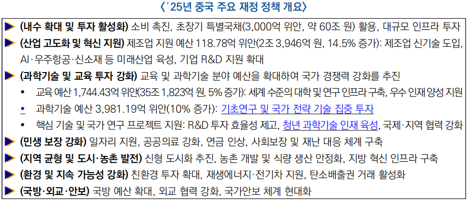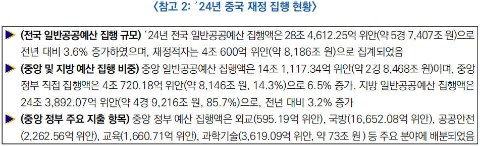 ![]() ○ (′25년 중앙 정부 예산) 중국 중앙 일반공공예산은 14조 7,460억 위안(약 2경 9,740조 원)으로, 전년 대비 4.5% 증가