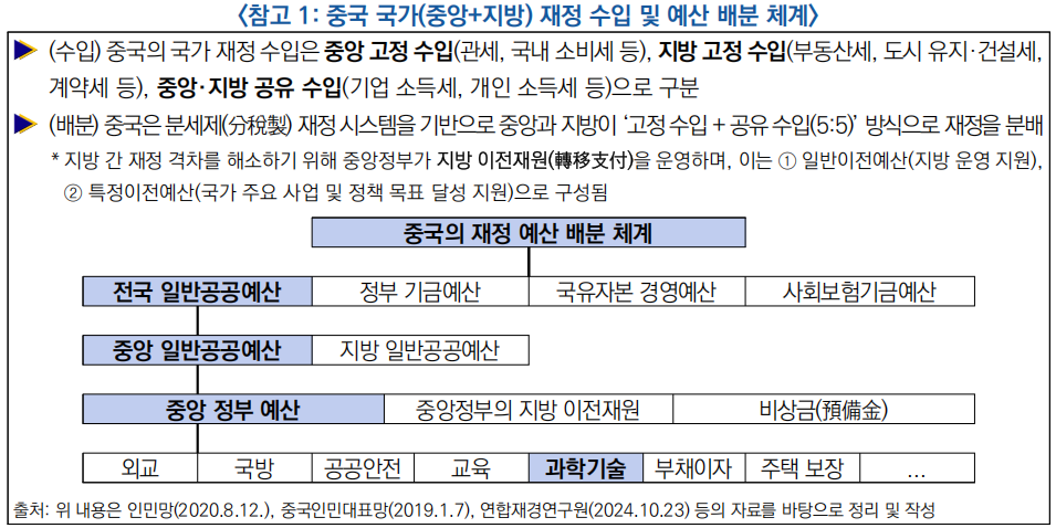 - 중앙 일반공공예산 중 지방 이전재원은 10조 3,415억 위안(약 2경 874조 원, 70.2%)으로 가장 큰 비중을 차지하며, 중앙 정부 예산은 4조 3,545억 위안(약 8,782조 원, 29.5%)으로 전년 대비 6.9% 증가