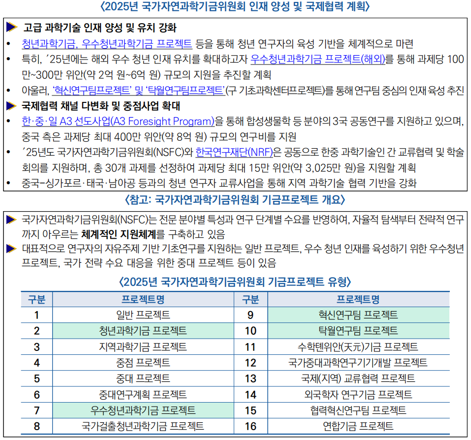 * 국가자연과학기금위원회(NSFC)는 1986년 국무원 승인으로 설립된 과기부 소속 기관으로, 기초연구 지원, 우수 인재 양성, 국제협력 촉진 등의 기능을 수행하고 있으며, 중국 기초과학 발전을 총괄함. 위원회 연간 연구지원 규모는 2010년 이후 100억 위안(약 2조 156억 원)을 상회함