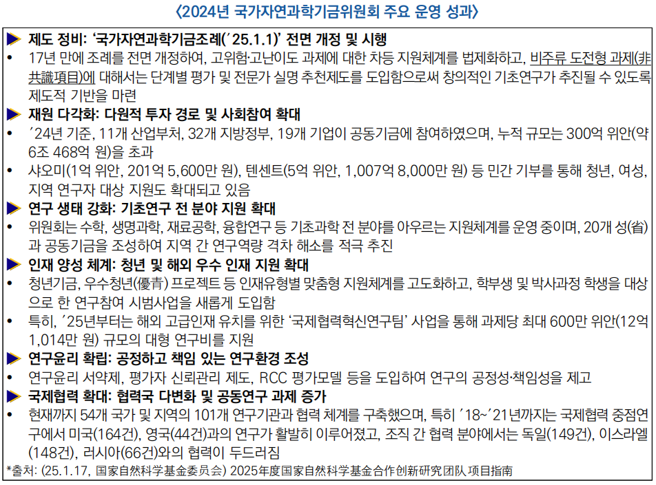 ○ (2024년도 주요 성과) 인허쥔(陰和俊) 과기부 장관은 회의에서 위원회가 ① ‘국가자연과학기금조례(25.1.1)’ 개정·시행, ② 다원적 투자경로 확대, ③ 기초연구 지원 강화, ④ 우수 인재 및 혁신 연구팀 육성, ⑤ 학풍·연구윤리 개선, ⑥ 국제협력 확대 등 성과를 거두었다고 언급