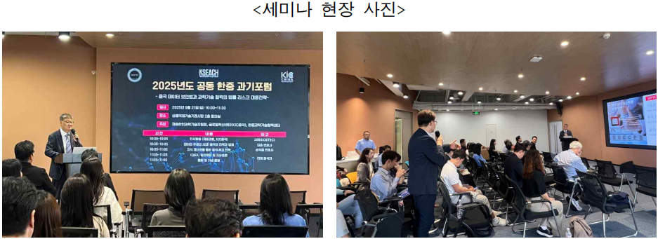 - 포럼에는 상하이 지역 기업, 언론, 정부 관계자 등 약 50명이 참석하여 최근 고조되는 중국 데이터 규제 환경과 과학기술 협력의 실무적 함의를 집중 논의했다.
