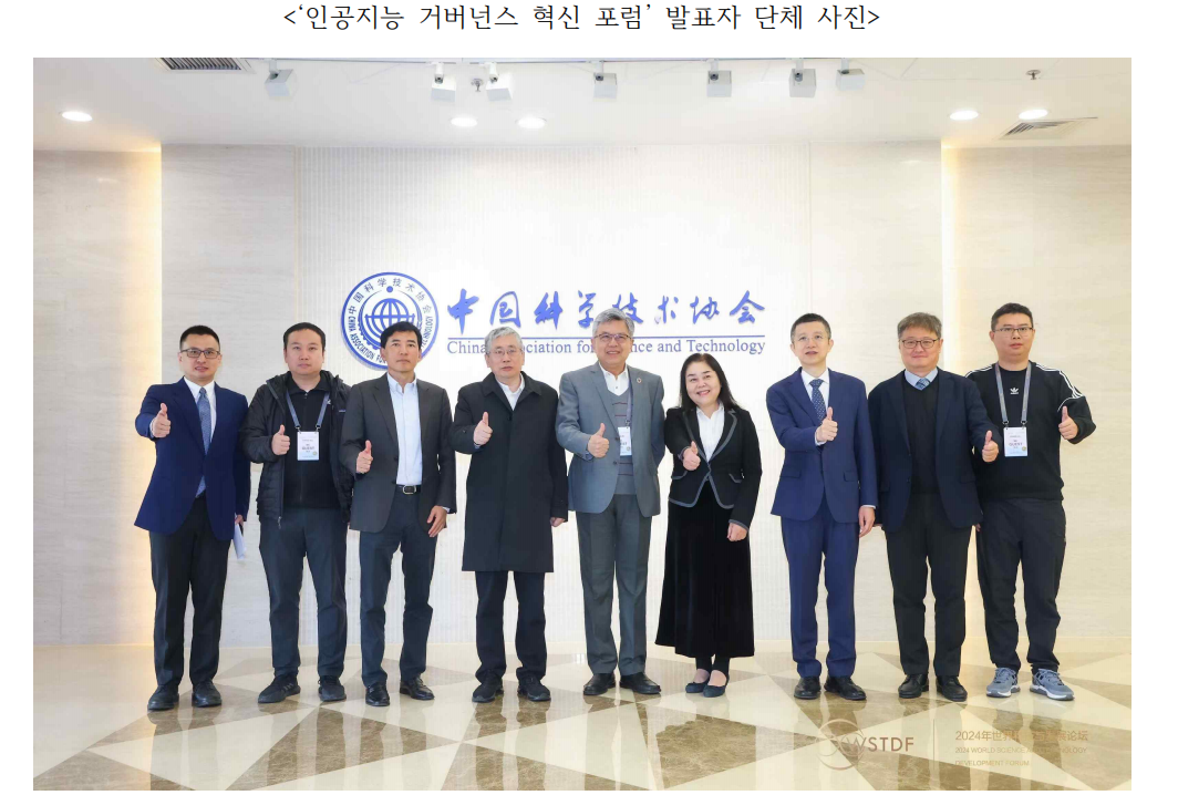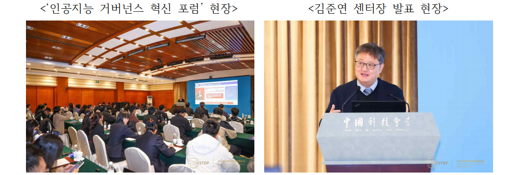 2024년 10월 23일, 한중과학기술협력센터 김준연 센터장은 중국과학기술협회(CAST)가 주최한 ‘2024 세계 과학기술 및 발전 포럼(WSTDF)’의 ‘인공지능 거버넌스 혁신’ 분과 회의에 참석해 주제 발표를 했다.