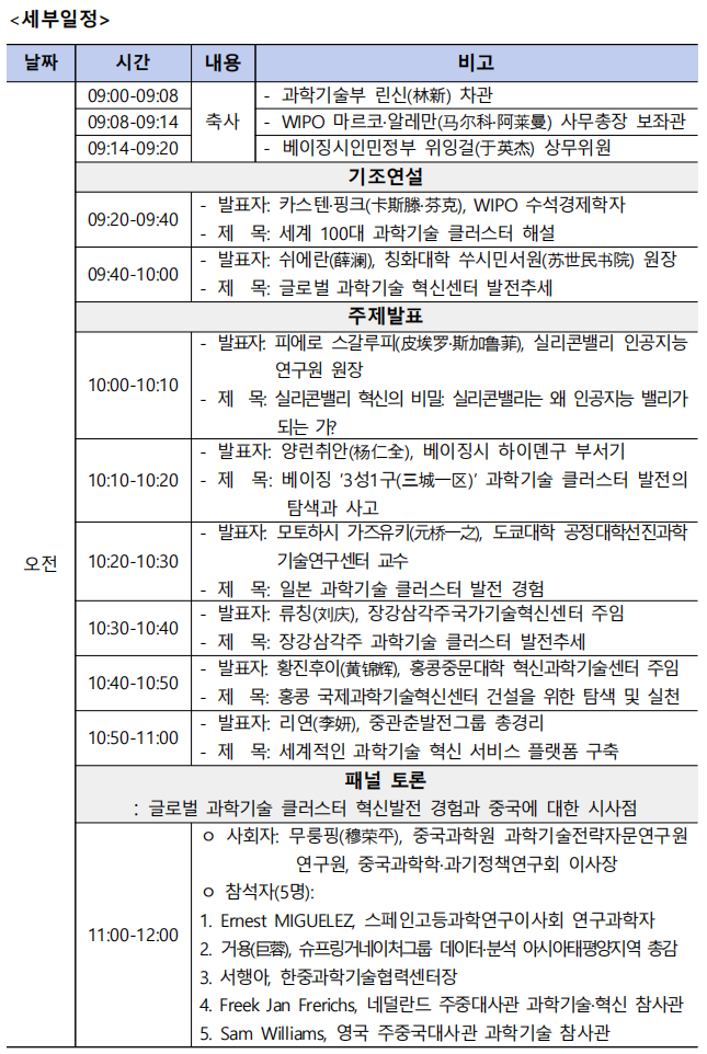 중국 과학기술부 린신(林新) 차관, 세계지식재산기구 마르코 알레만(马尔科·阿莱曼) 사무차장, 베이징시인민정부 위잉걸(于英杰) 상무위원, 국제기구 및 세계 최고 과학기술 클러스터 대표 등 100여 명이 참석했다.