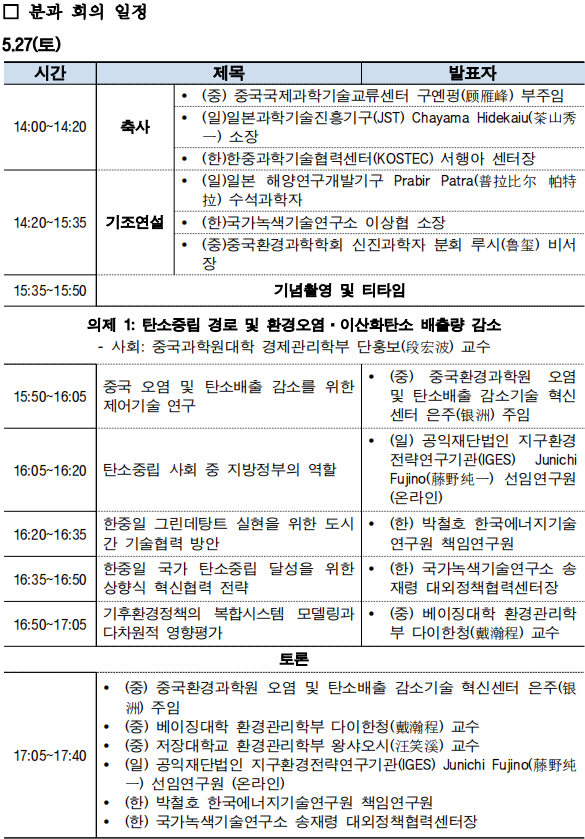 5월 27일 오후부터 28일 오전까지 진행되었으며 중국국제과학기술교류센터(CISTE), 한중과학기술협력센터(KOSTEC), 일본과학기술진흥기구(JST) 베이징대표처 중국환경과학학회, 중국환경과학연구원, 칭화대학 탄소중립연구원이 공동 주최하였다. 또한 중국환경과학학회 신진과학자분회, (한국) 국가녹색기술연구소(NIGT)가 주관기관으로 참여했다.