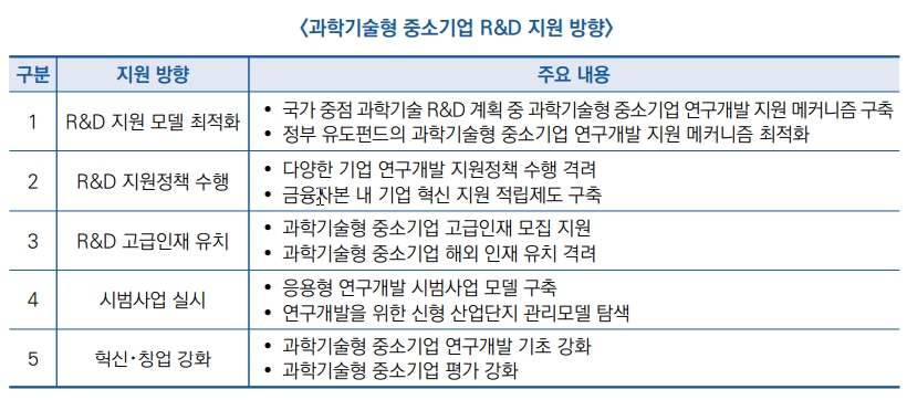 ● 기업 지원 방향은 과학기술형 중소기업 △R&D 지원 모델 최적화 △R&D 지원정책 수행 △R&D 고급인재 유치 △시범사업 실시 △혁신・창업 강화 등으로 구성