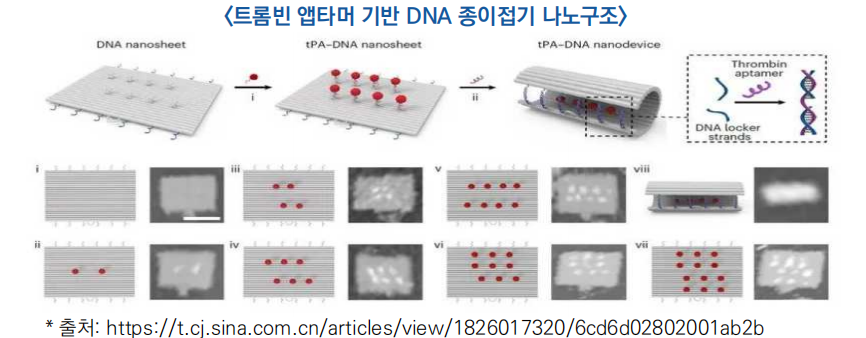 - 연구진은 먼저 DNA 종이접기 기술을 활용하여 길이 90nm, 폭 60nm의 직사각형 조각을 구성하고 혈전용해 약물분자를 투입