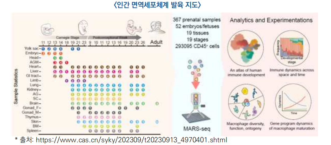 ○ 중국과학원 선진선진기술연구원 리한제(李漢杰) 연구진은 현재 기준 가장 높은 샘플링 밀도를 보이는 인간 면역체계 발육지도를 구축한 ‘소교세포 유사세포(microglia-likecell)’를 최초로 발견