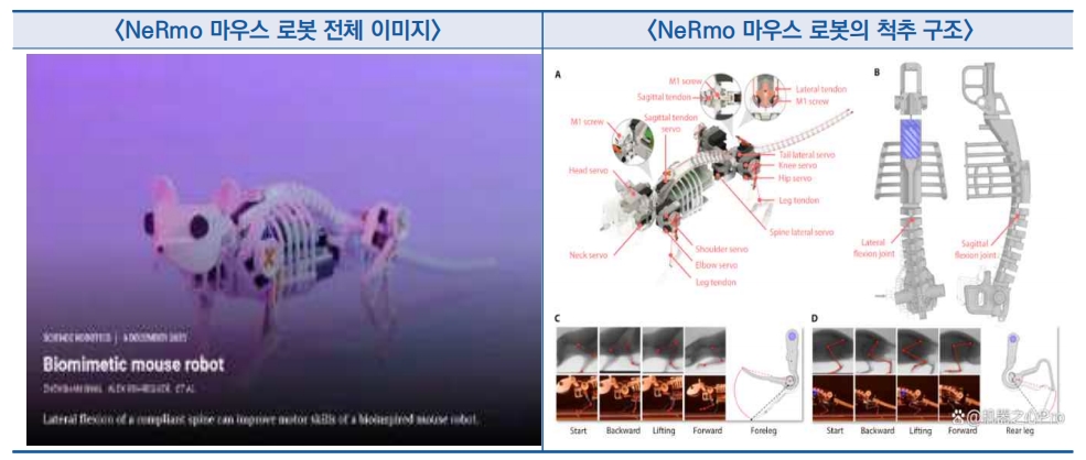 - 연구진은 부드럽고 탄력 있는 척추기술을 혁신적으로 사용하고 마우스의 형태와 힘줄 구동 시스템을 모방한 로봇 NeRmo을 개발