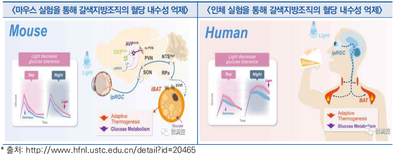 ○ 중국과학기술대학의 쉐톈(薛天) 교수는 쥐와 인체 실험을 통해 망막에 있는 ipRGC 광감수성 세포를 활성화시켜 혈당 대사를 조절하는 신경 기전을 규명