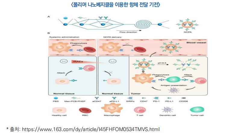 - 미세 유체공학 기술을 이용해 개발한 폴리머 나노베지클은 종양 산성 활성화 면역치료를 위한 CD47/PD-L1(NCPA) 항체 전달에 사용됨