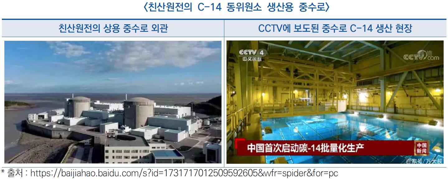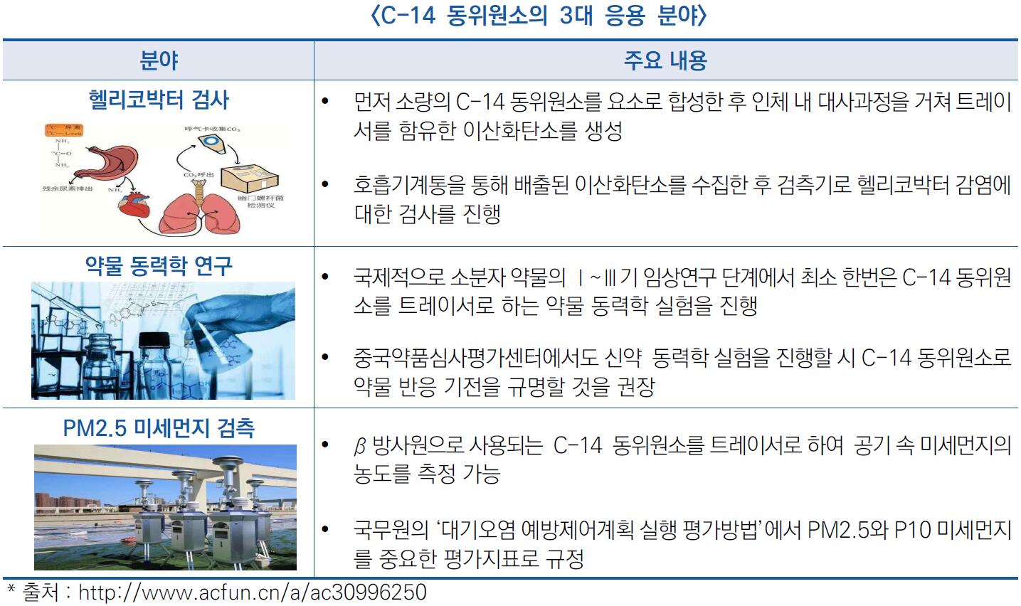 - 중국은 현재 실험연구에 사용되는 소형 원자로를 이용해 C-14 동위원소를 소량 생산하고 있지만, 안정적인 공급이 어려워 대부분 수입에 의존하고 있는 상황