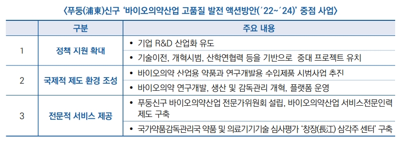 ▣ 상하이 바이오산업 핵심지역인 푸둥(浦東)신구는 ‘바이오의약산업 고품질 발전 액션방안(′22~′24)’을 발표하여 세계적인 바이오의약산업 클러스터를 육성할 계획(2.7)