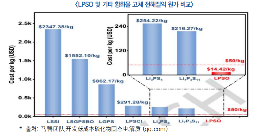 - 연구진은 고가의 황화 리튬을 원료로 사용하지 않는 신형의 황화물 고체 전해질 ‘LPSO(Li7P3S7.5O3.5)’을 개발했는데, 킬로그램당 14.42달러에 불과하여 가격 경쟁력이 높음
