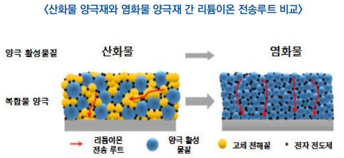 - 전고체 리튬 배터리의 산화물 양극재(리튬 코발트, 리튬 인산철 등)는 이온전도율이 낮고, 균열이 쉽게 발생하는 등의 단점이 존재