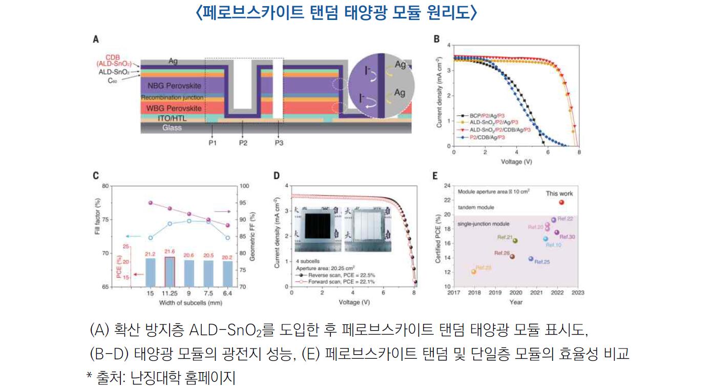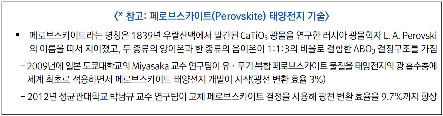 - 향후 1㎡ 이상 면적의 태양광 모듈 개발을 위한 고품질의 균일한 페로브스카이트 박막제조 및 모듈 내 연결 안정성 테스트 등 기술개발에 주력할 계획