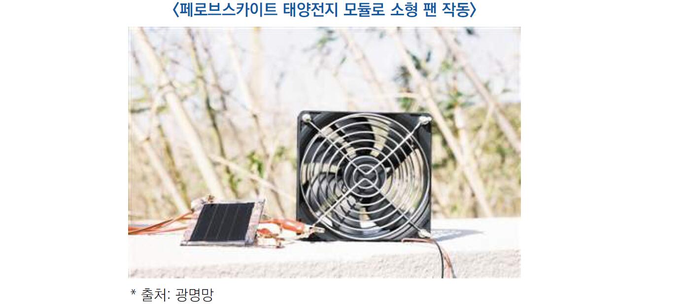 - 새로운 터널접합구조를 기반으로 코팅인쇄, 진공증착 등 제조기술로 개발한 20㎠ 면적의 페로브스카이트 탠덤 태양전지 모듈로 소형 팬을 작동시키는데 성공