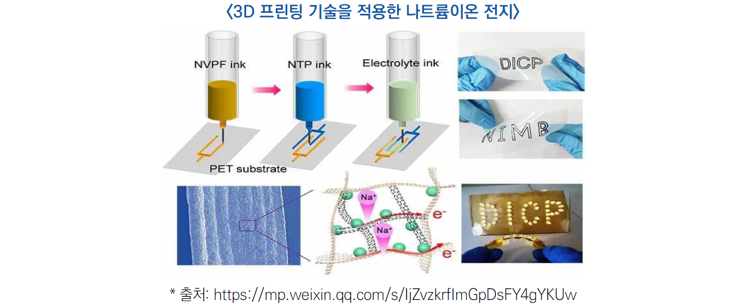 ○ 최근 중국과학원 다롄화학물리연구소 우중솨이(吴忠帅) 연구진은 3D 프린팅 기술을 활용하여 면적 대비 용량이 매우 큰 나트륨이온 전지 개발에 성공