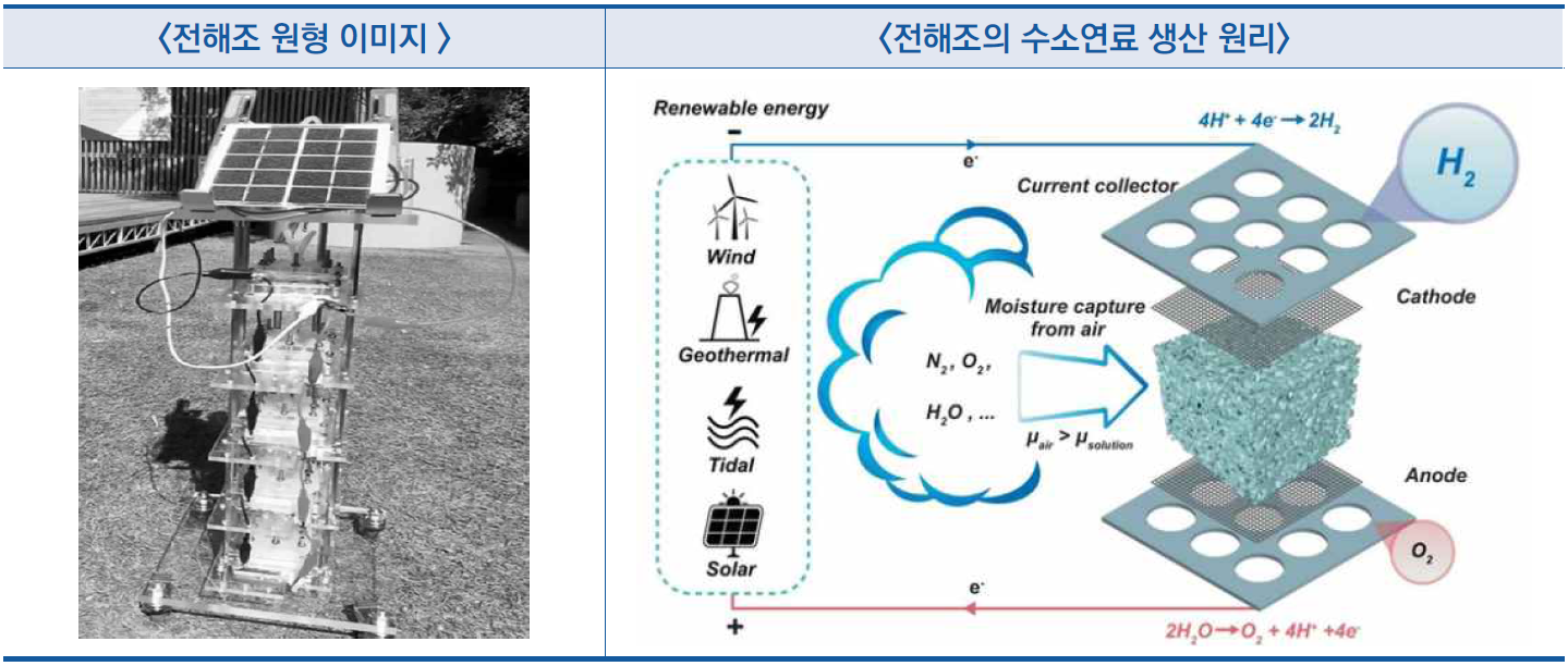 ○ 연구진은 액체 상태의 물이 아닌 공기 중의 수분만을 이용해 수소연료를 생산할 수 있는 전해조(electrolysis bath) 원형을 개발